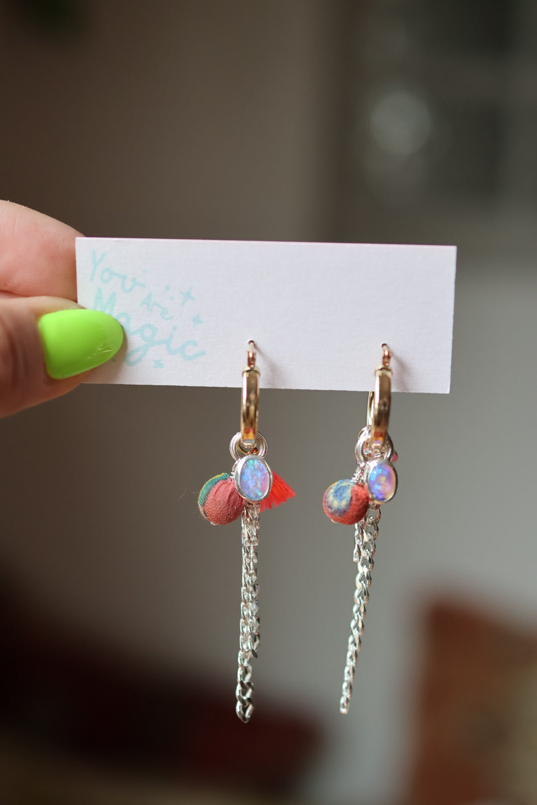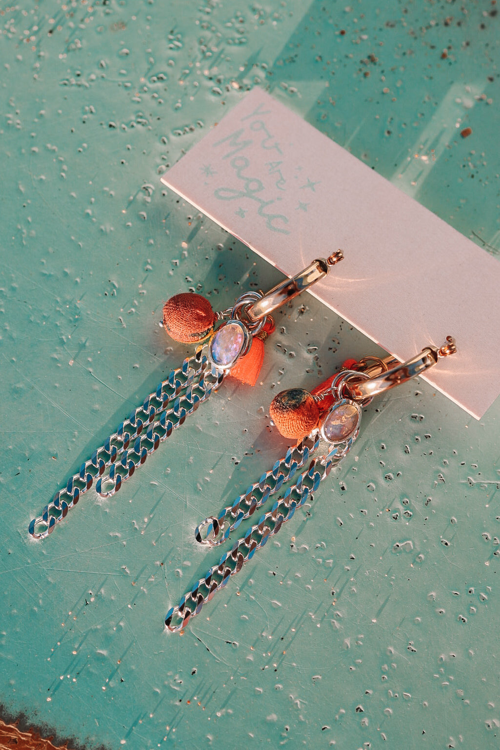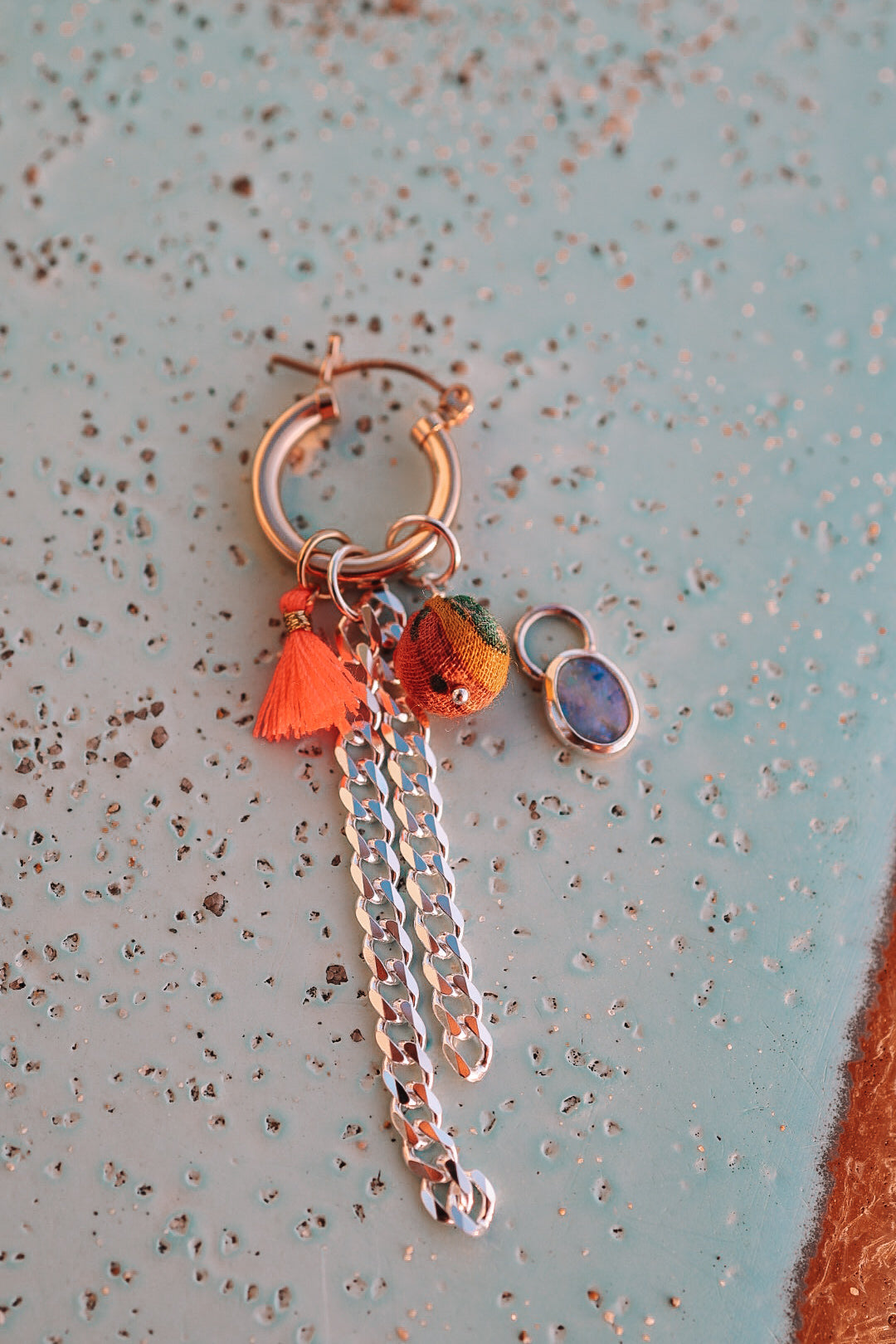 Gold filled hoops with a twist! These timeless mixed-metal hoops feature crystal opals set in sterling silver stacked up with some funky charms like a fabric bead, neon coral tassle and sterling silver curb chain