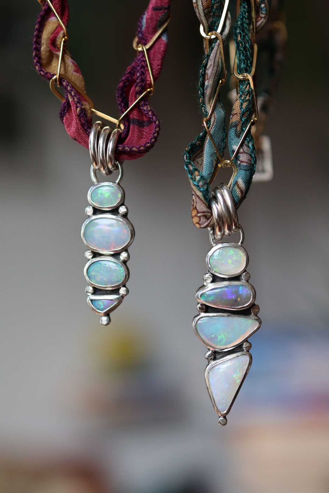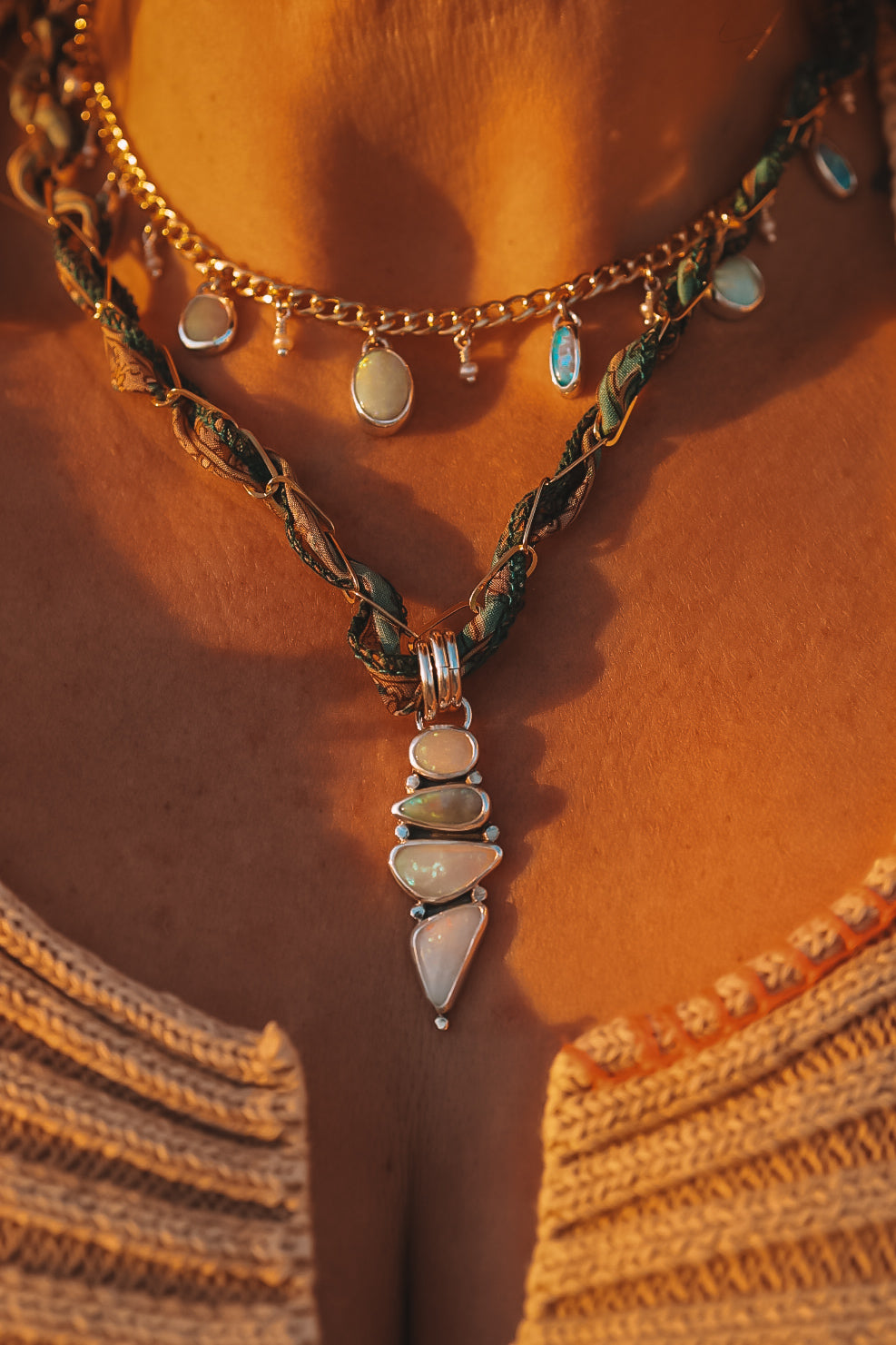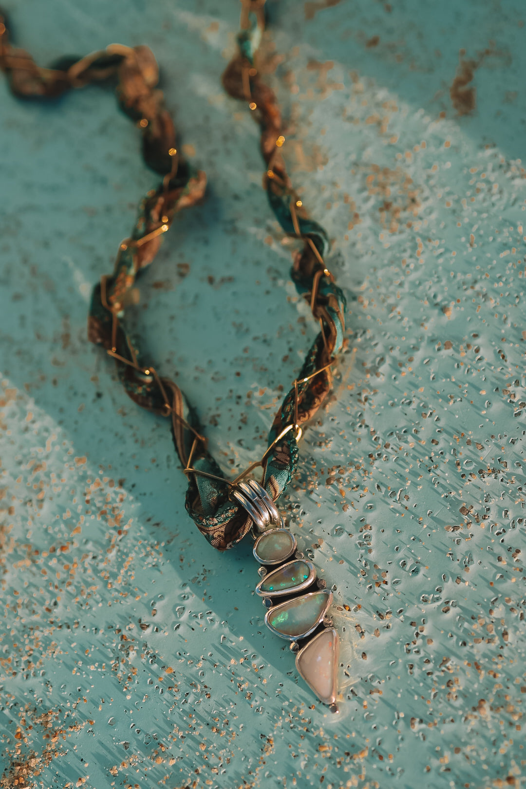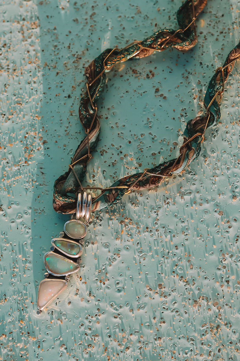 14k yellow gold paperclip chain threaded with recycled silks. Strung with a stack of some of the flashiest Australian opals you ever did see! The backs of the bezels have been sawn out to let light through- which also lets the opals change colors depending on its background.