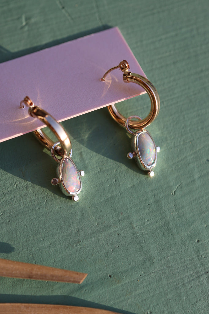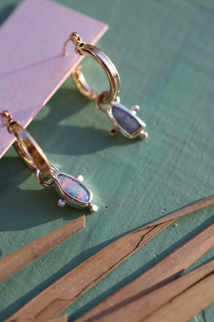 Gold filled hoops with a twist! These timeless mixed-metal hoops feature opal doublets set in sterling silver. A fresh modern balance of shine and color!