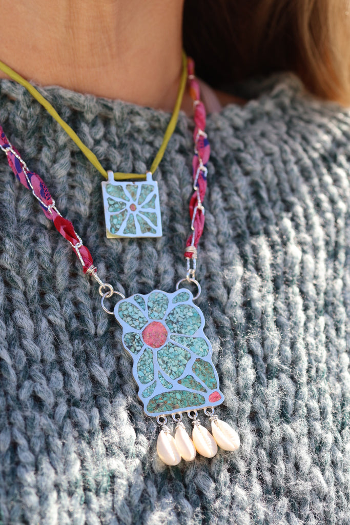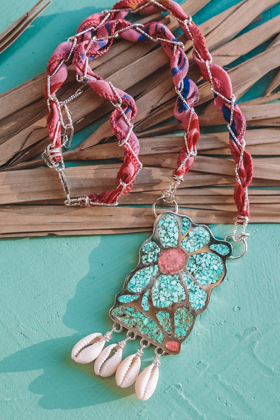 What a result of the creative process looks like! Hand carved wax pendent casted in sterling silver featuring a colorful play of inlay. The sparkle paperclip chain is woven with recycled silk for that fun pop of color and texture!