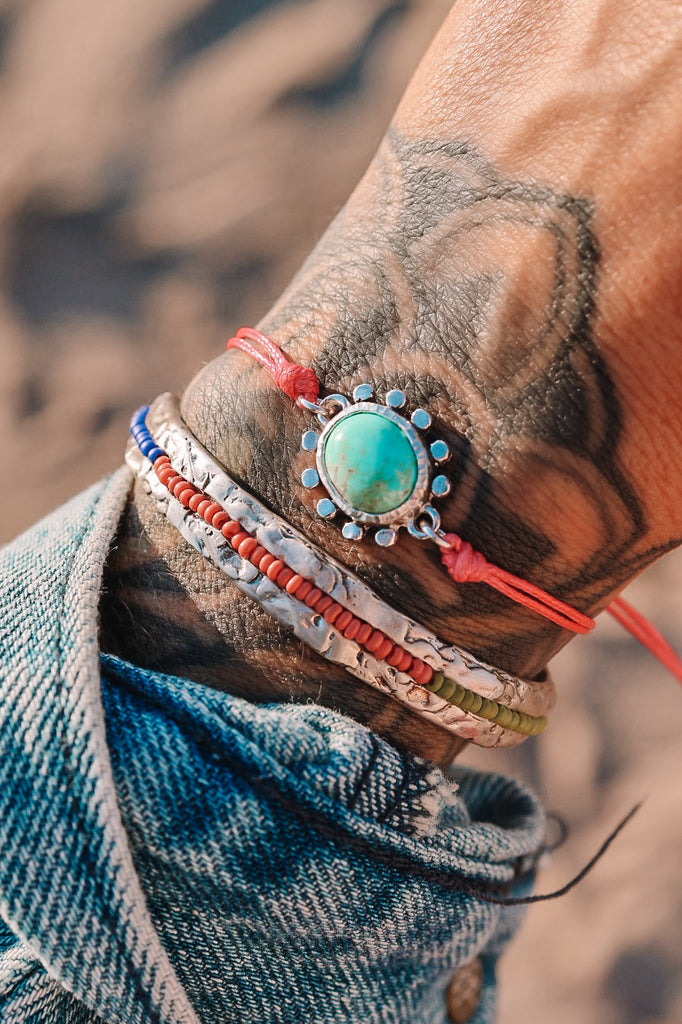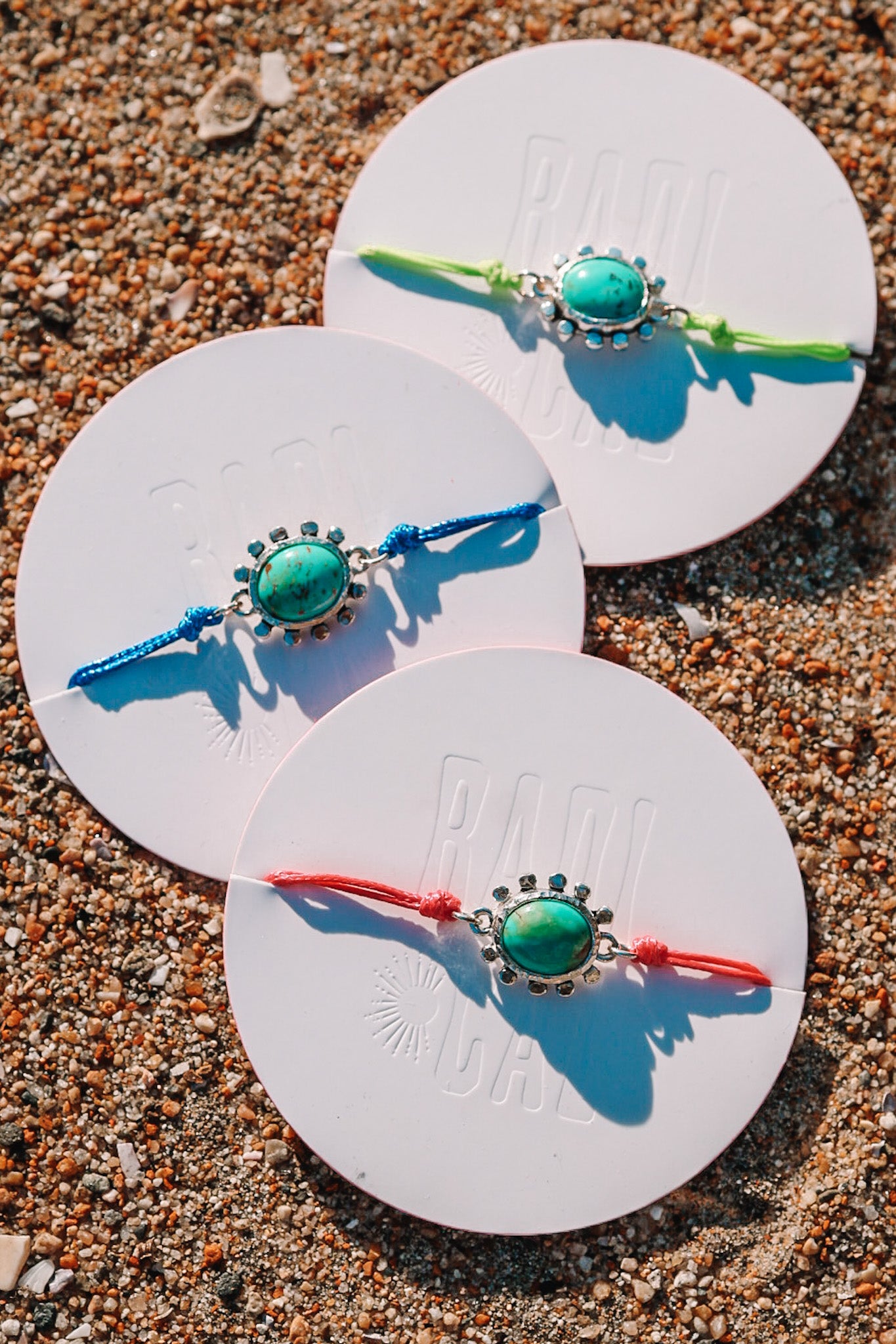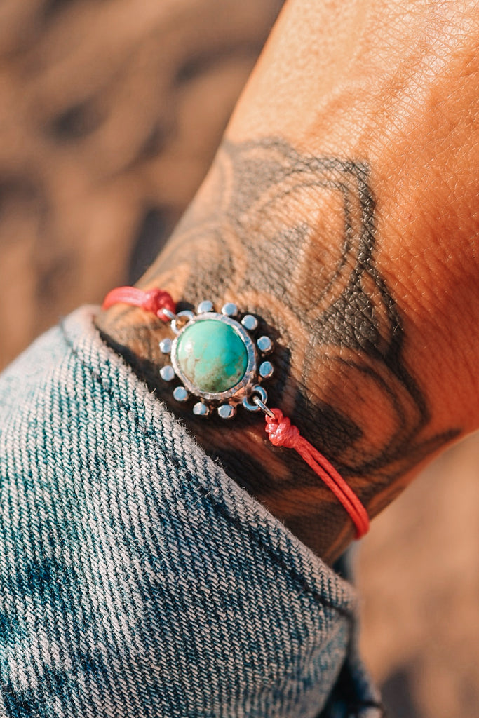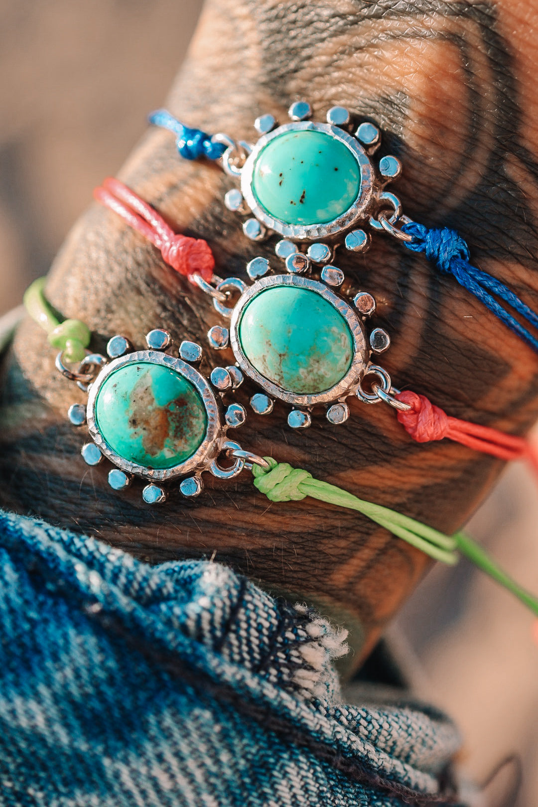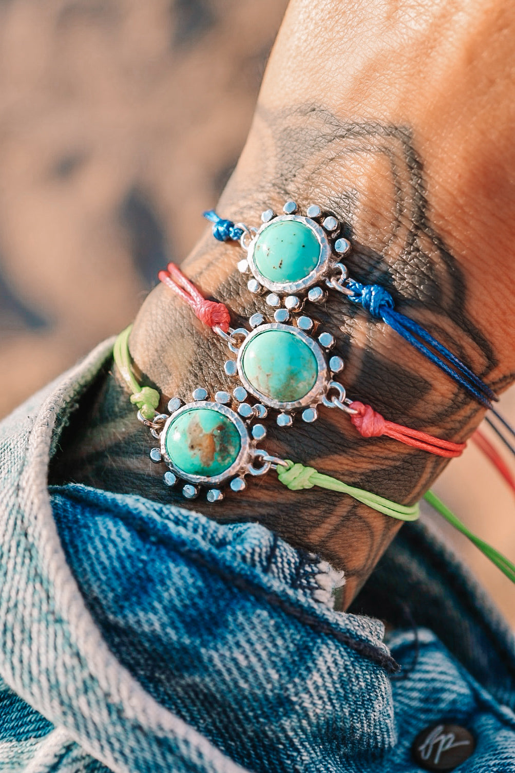 A sterling set turquoise stone on a bright, adjustable cord bracelet. Vibrant, effortless and ready to stir up a little RIOT! The handmade setting features my makers mark and a hammered bezel for the perfect amount of texture.