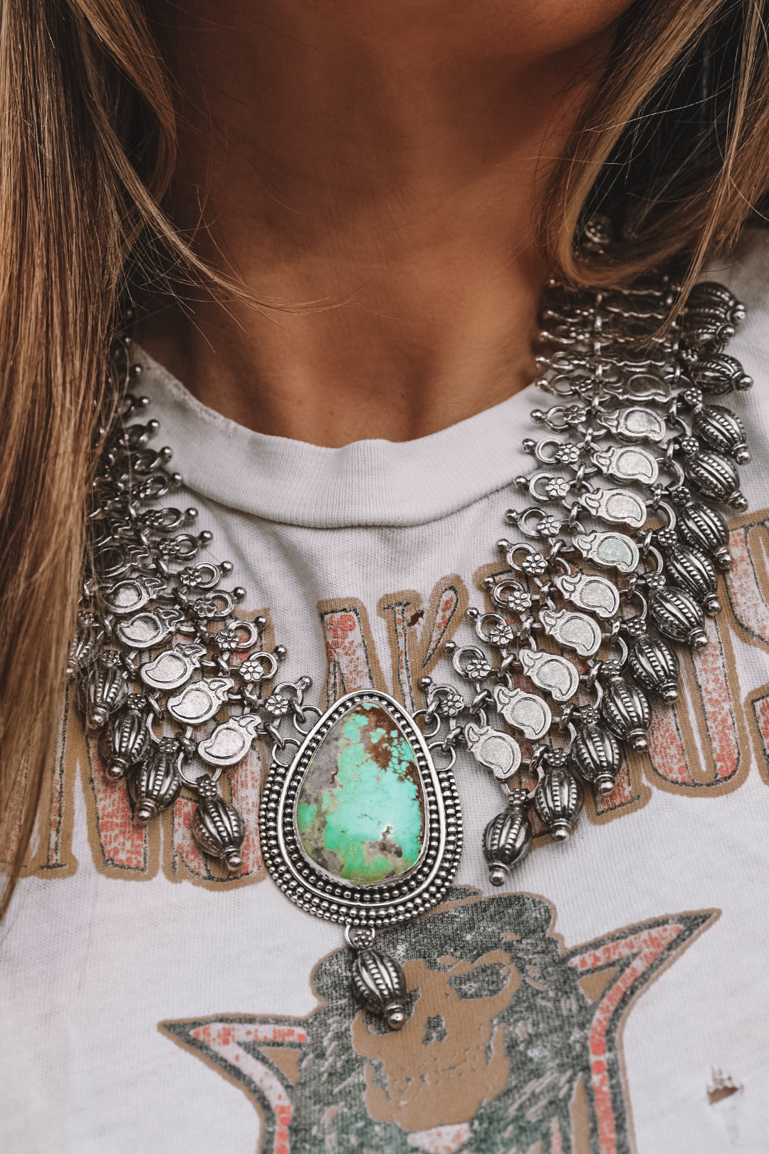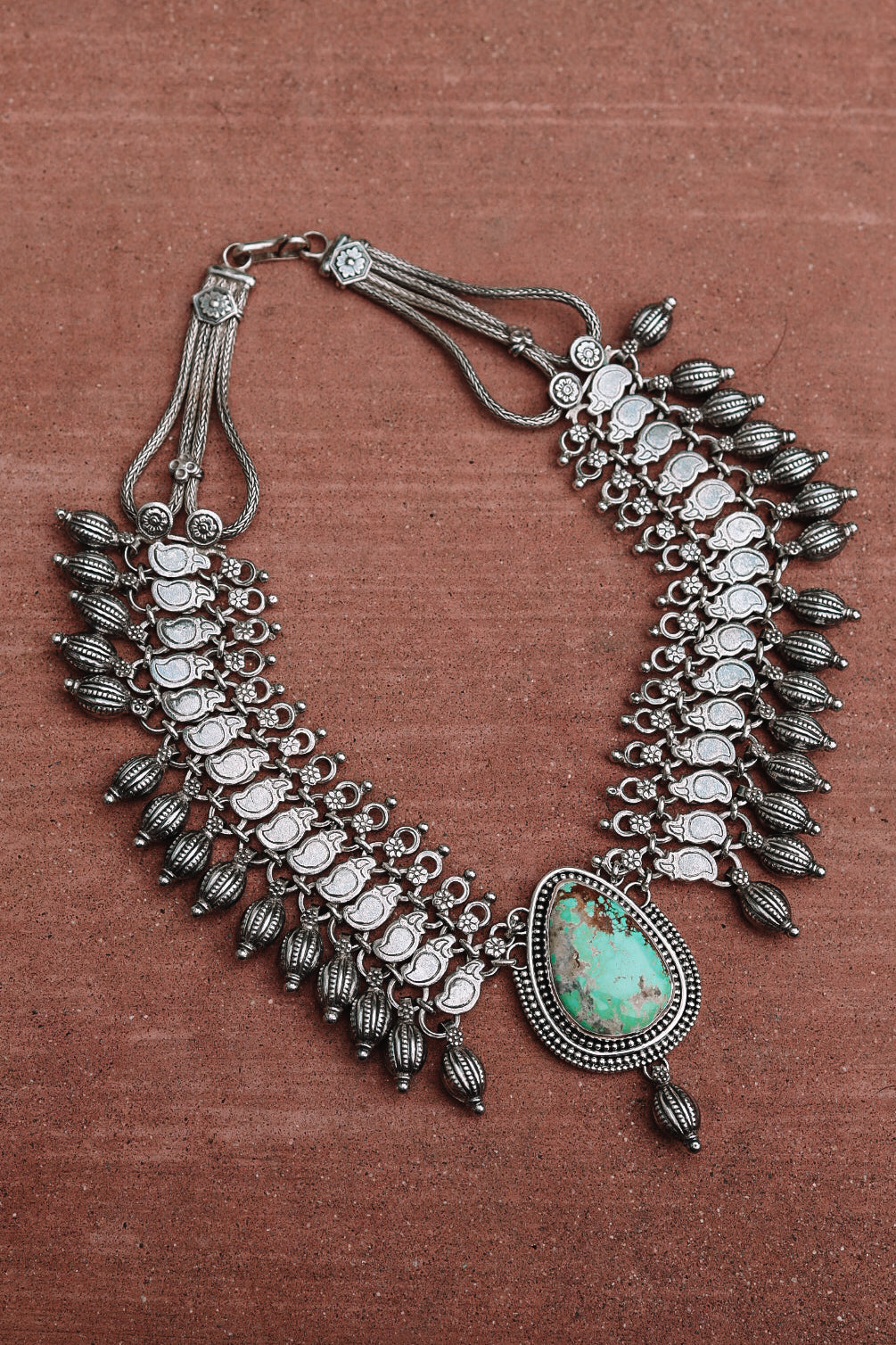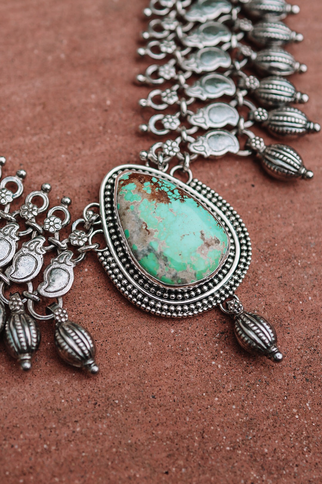 Gorgeous Mantis Variscite set in a handmade mandala like pendent. Held by a absolutely beautiful vintage ceremonial Rajasthani sterling silver bib chain weighing in at 251 grams! This piece is heavy and feels like a piece of armor. Utterly obsessed!