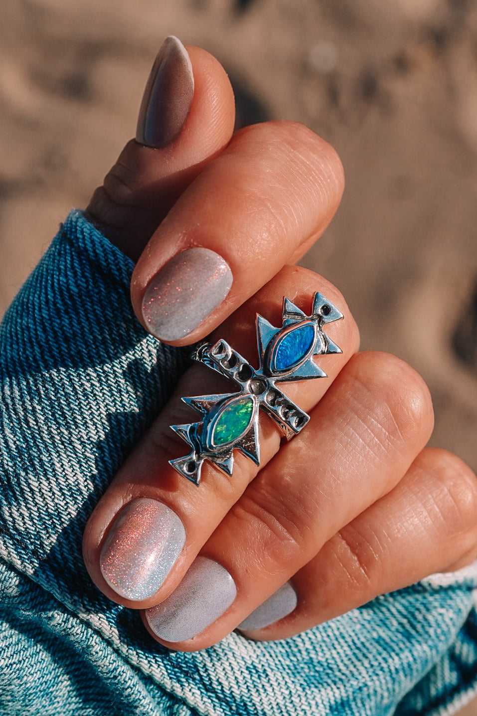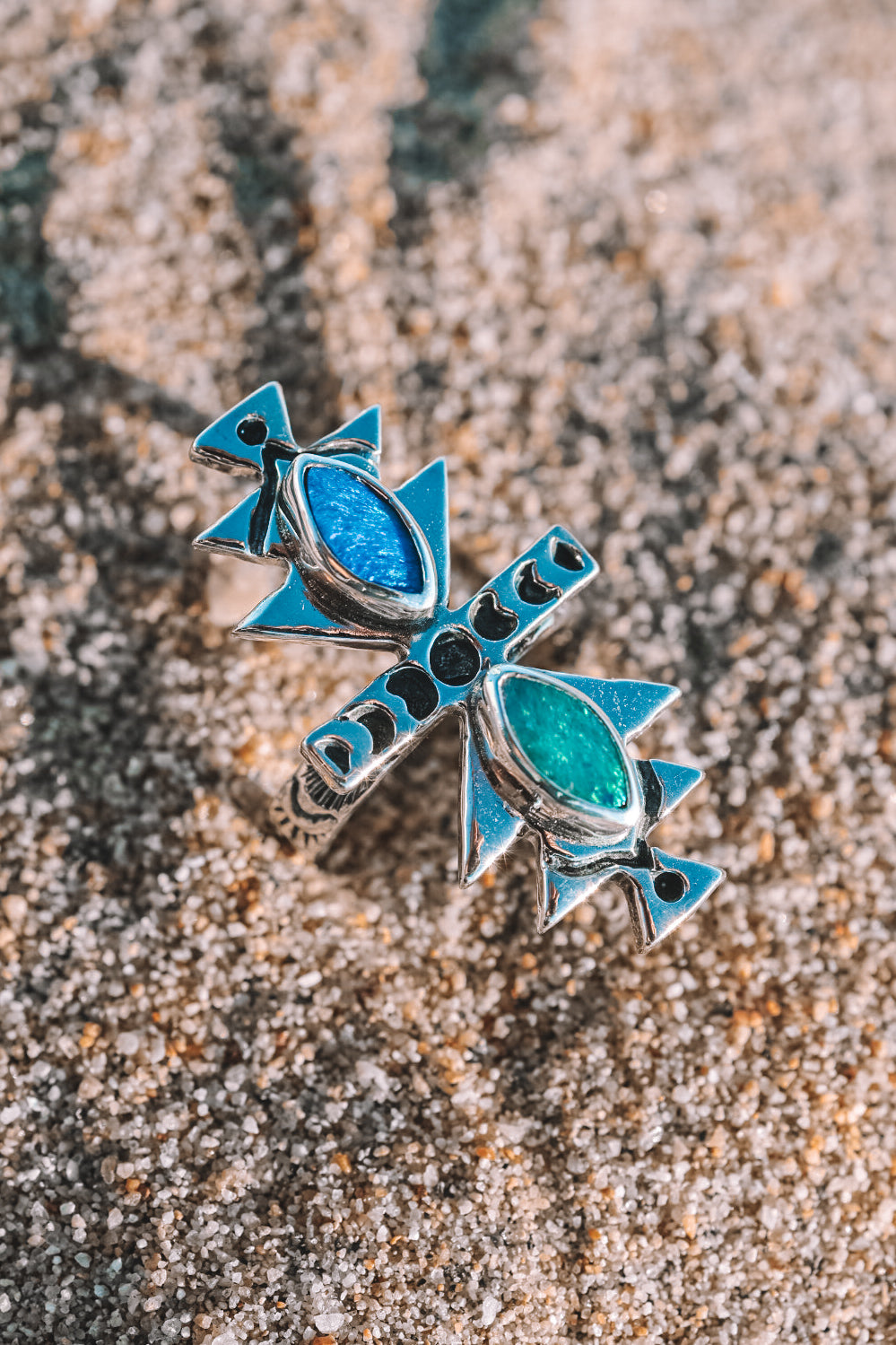 Hand carved and cast, these rings are inspired by the stepped pyramid details seen atop buildings throughout my travels in Morocco. Bold geometry, rich blue-green opal doublets, and a timeless, collected feel