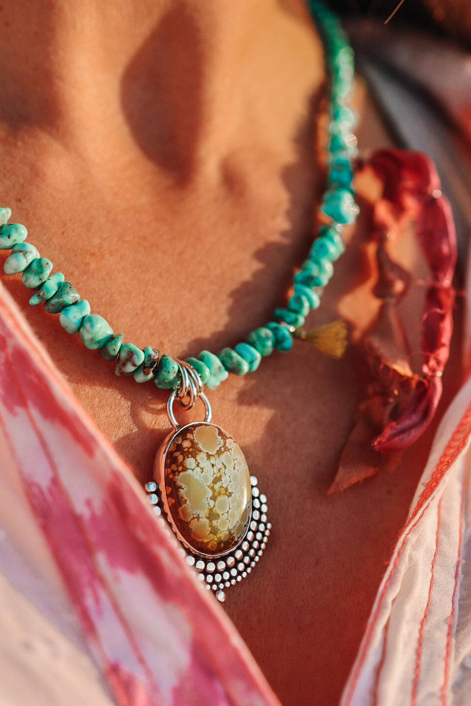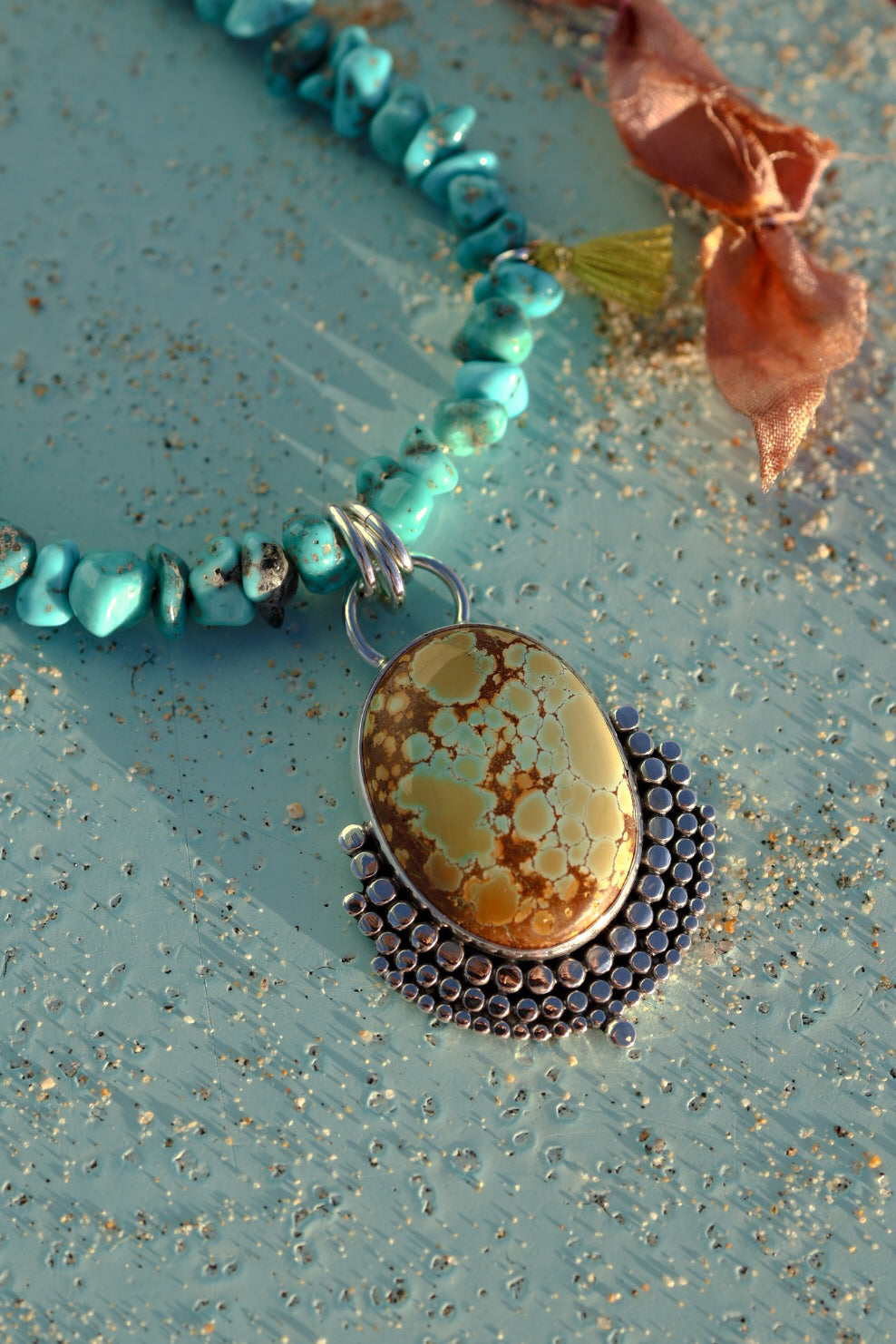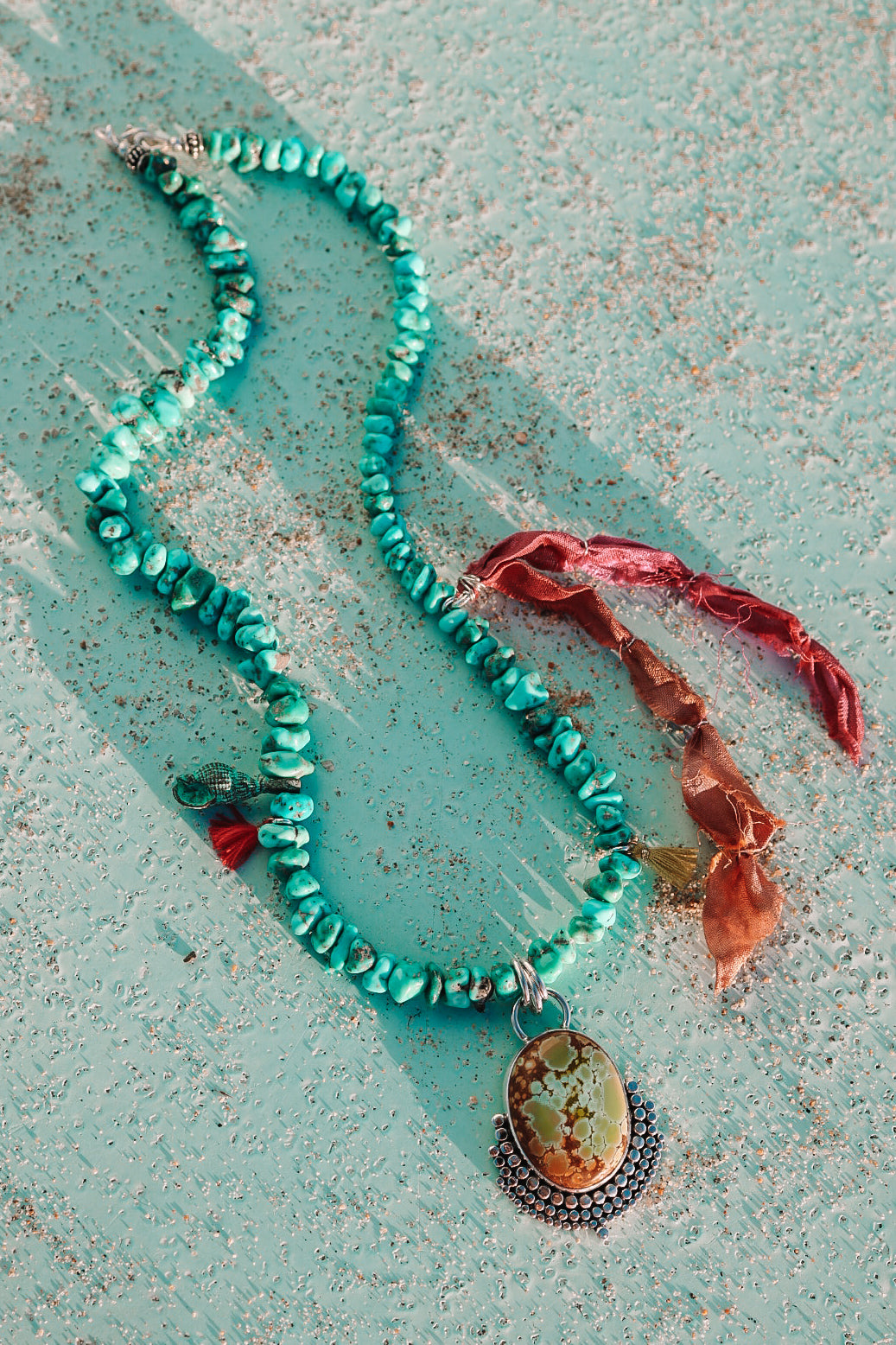 A strand of natural turquoise paired with a one of a king mandala like pendant and recycled silk ties. inspired by the beauty of objects shaped by the water, time and movement