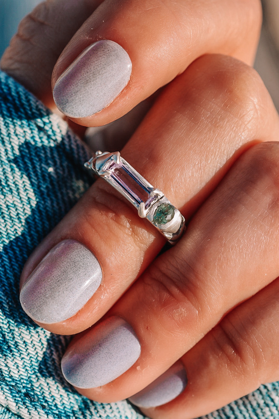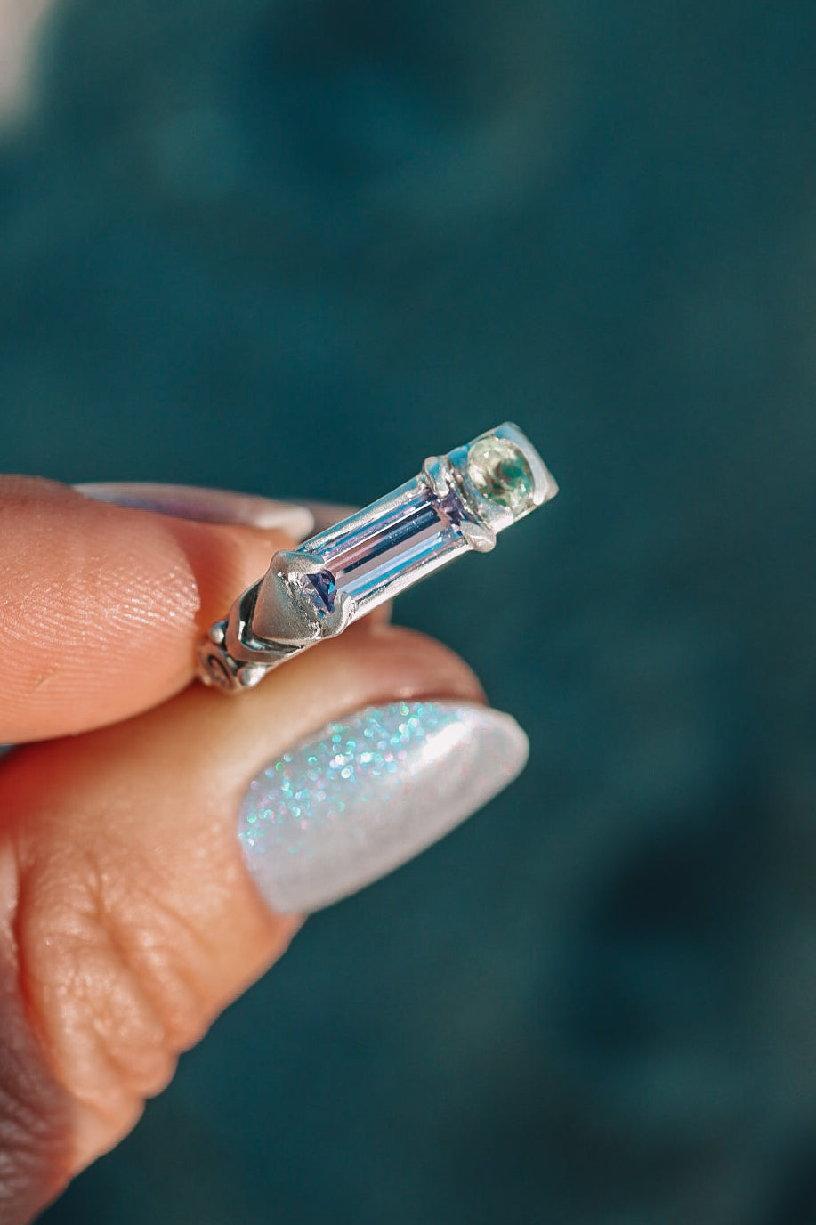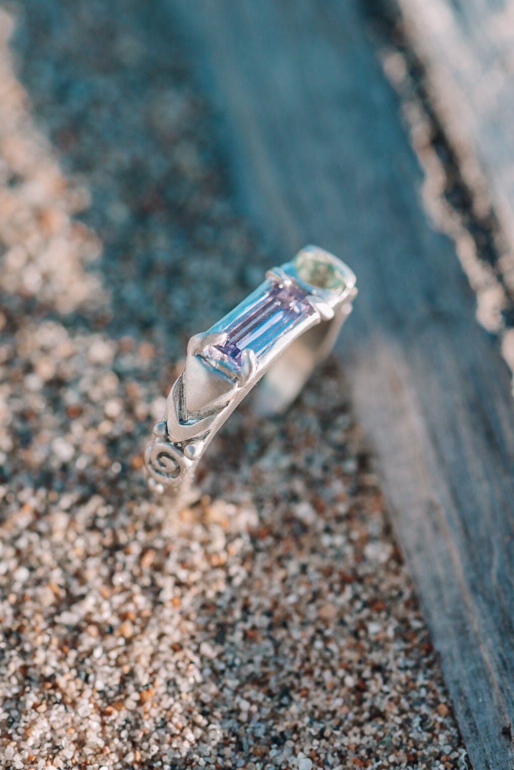 STONE:  .43ct Purple sapphire baguette & yellow/green montana sapphire ( that i mined myself!)