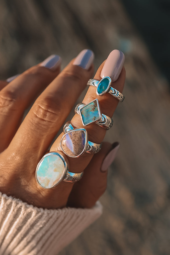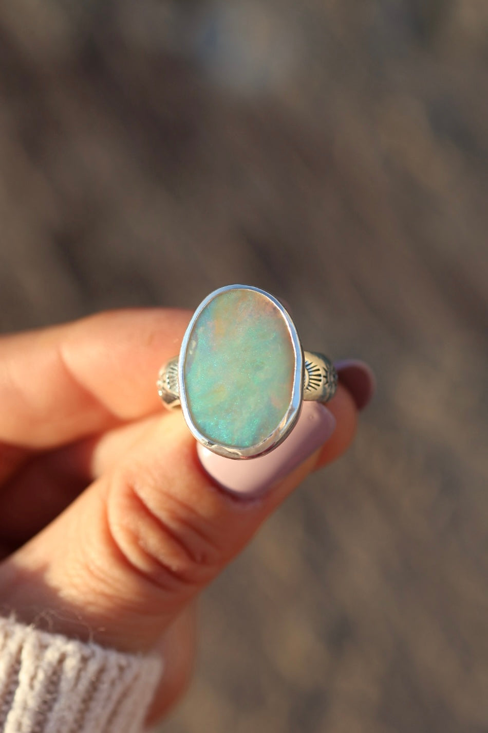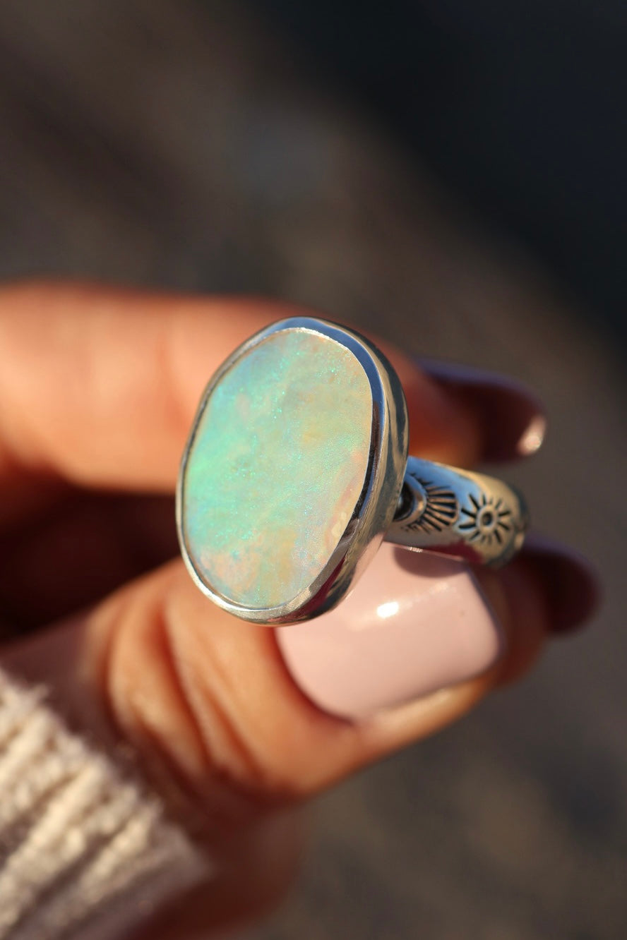 Letting the opal do all the talking here. Insane solid Australian opal set on a chunky hand stamped rounded band.