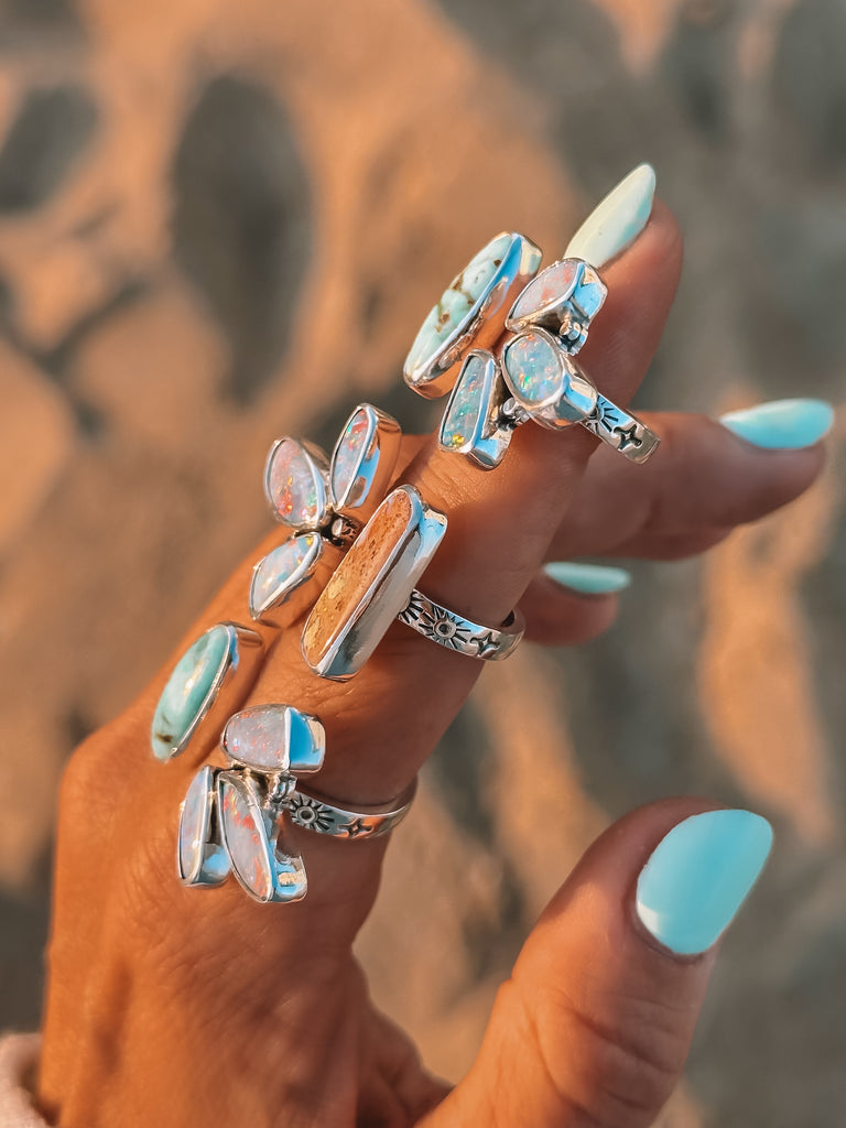 These little cutie open shank rings are perfect for everyday and are slightly adjustable! featuring a half flower made of flashy opals