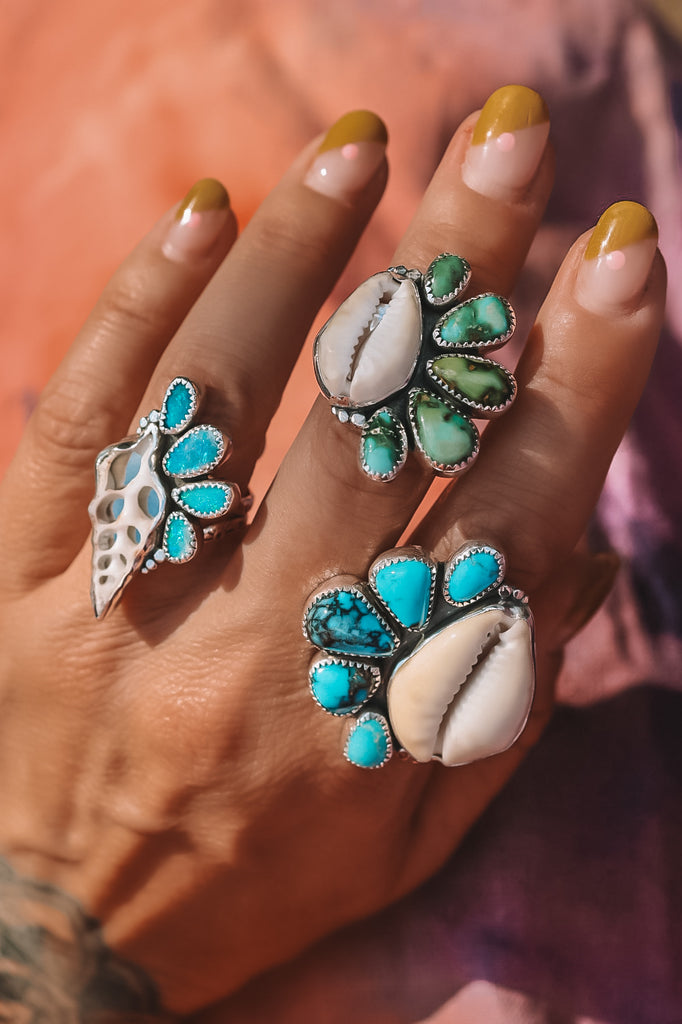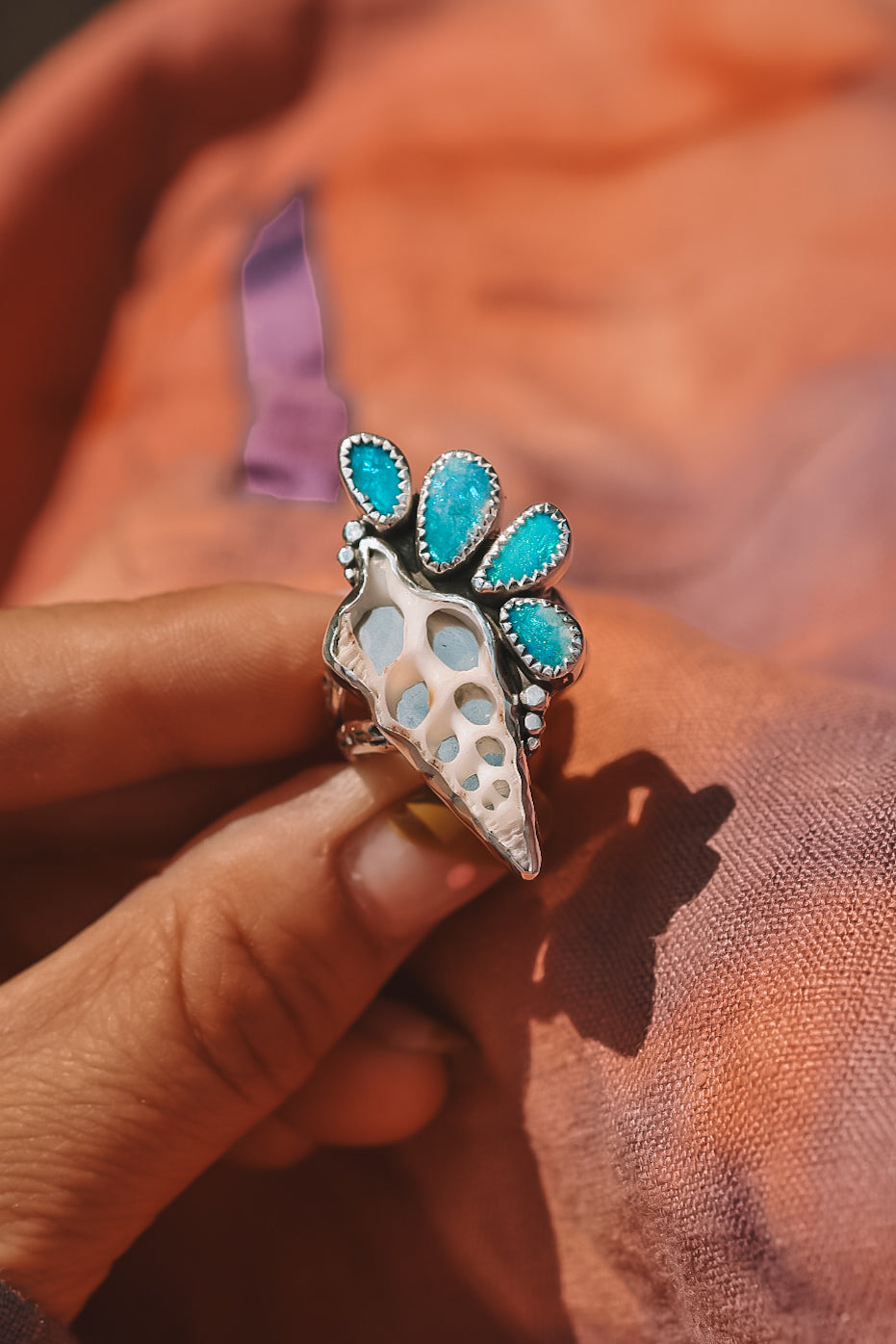 These one of a kind ring pairs natural cone shell- gathered on the shores of Bora Bora- with fiery clusters blue opal doublets. Made to feel like keepsakes from somewhere warm and wild. Each one carries a bit of island daydream and ocean energy.