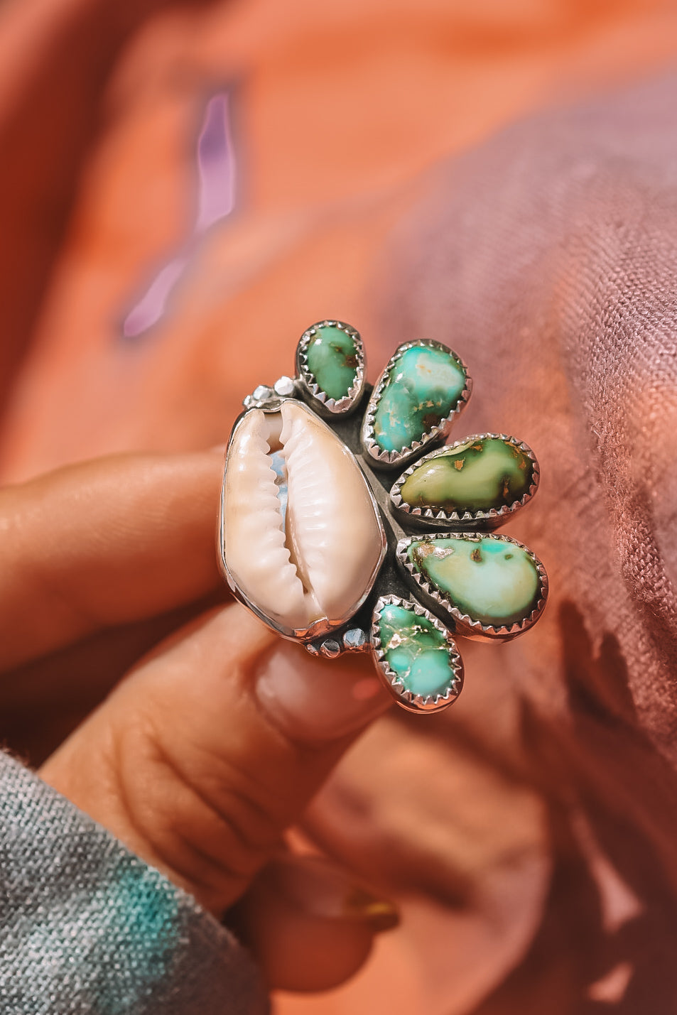 These one of a kind rings pair natural cowrie shells- gathered on the shores of Bora Bora- with fiery clusters turquoise. Made to feel like keepsakes from somewhere warm and wild. Each one carries a bit of island daydream and ocean energy.