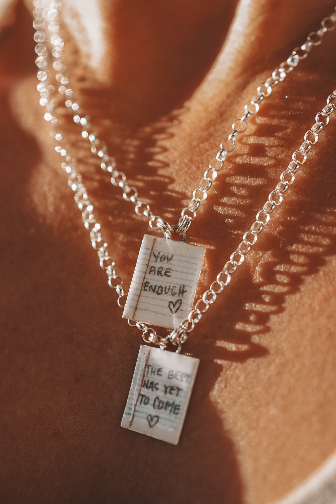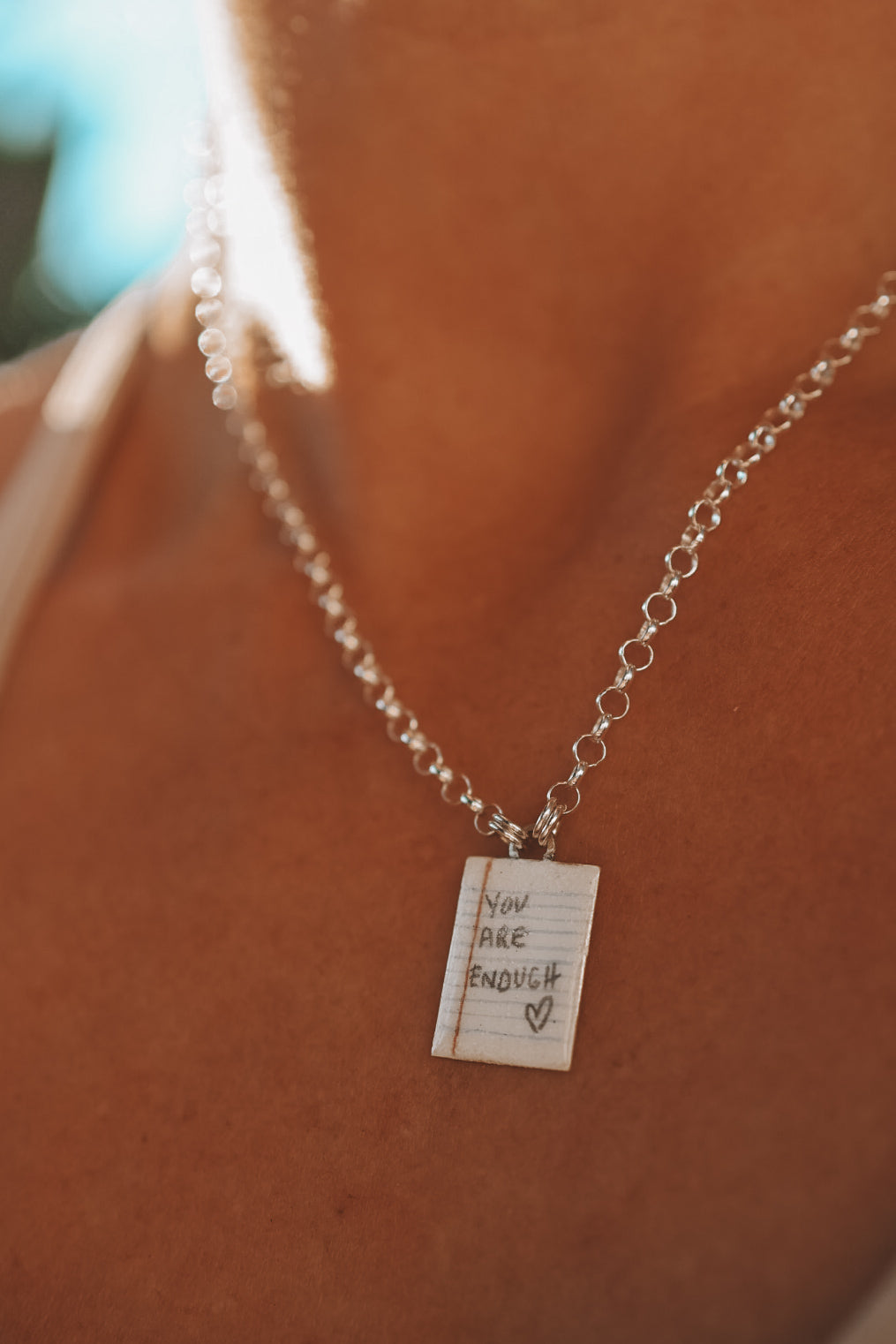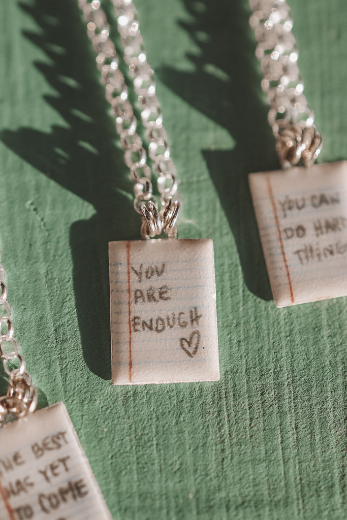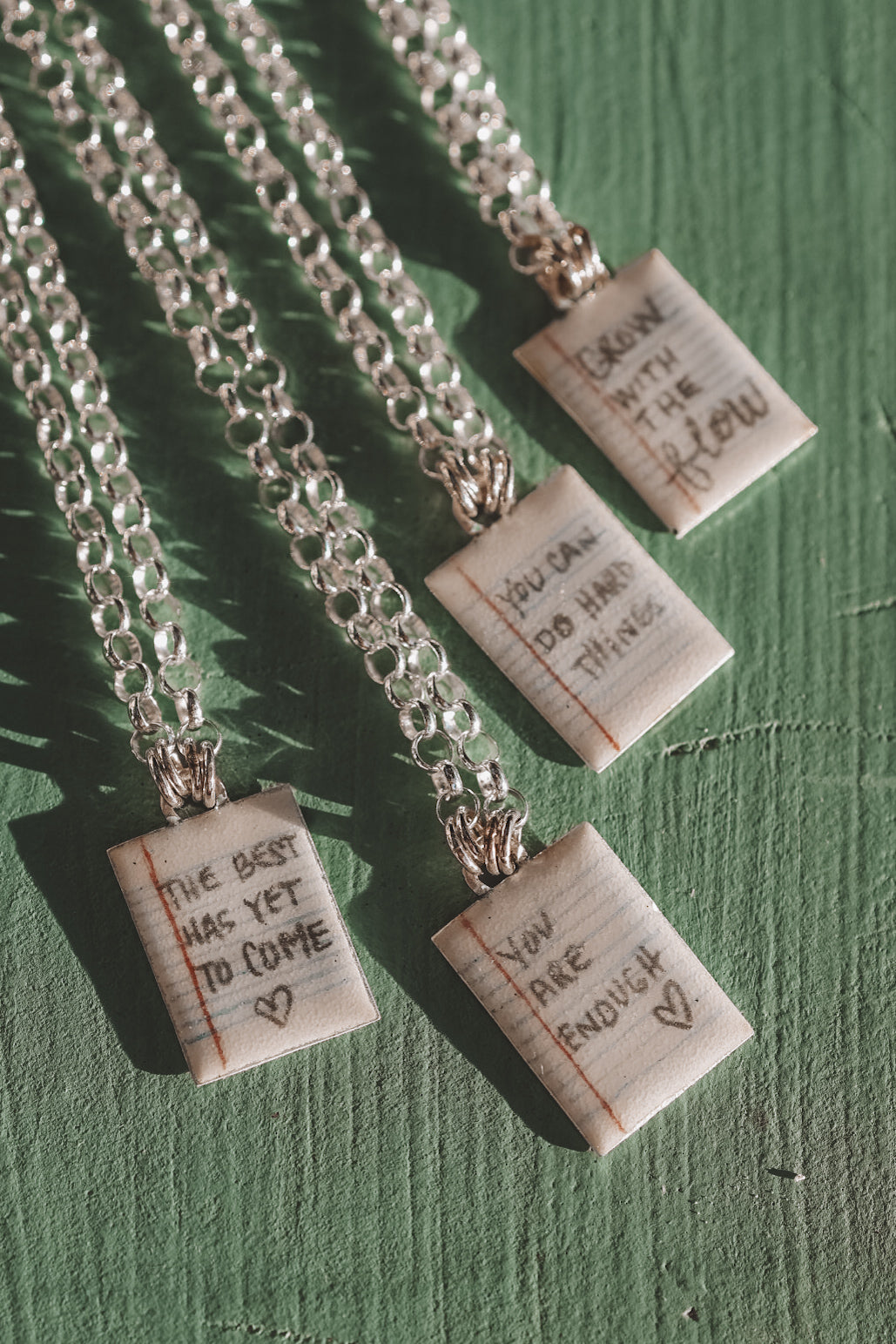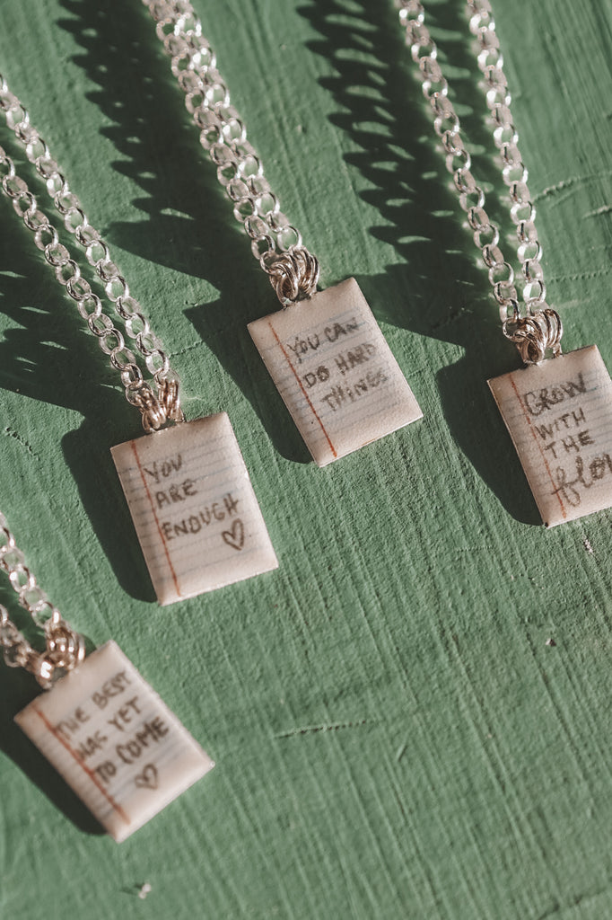 Hand painted enamel pendants designed to look like a sheet of notebook paper. Each is inscribed with a simple affirmation... A tiny love note to yourself to carry with you everyday.