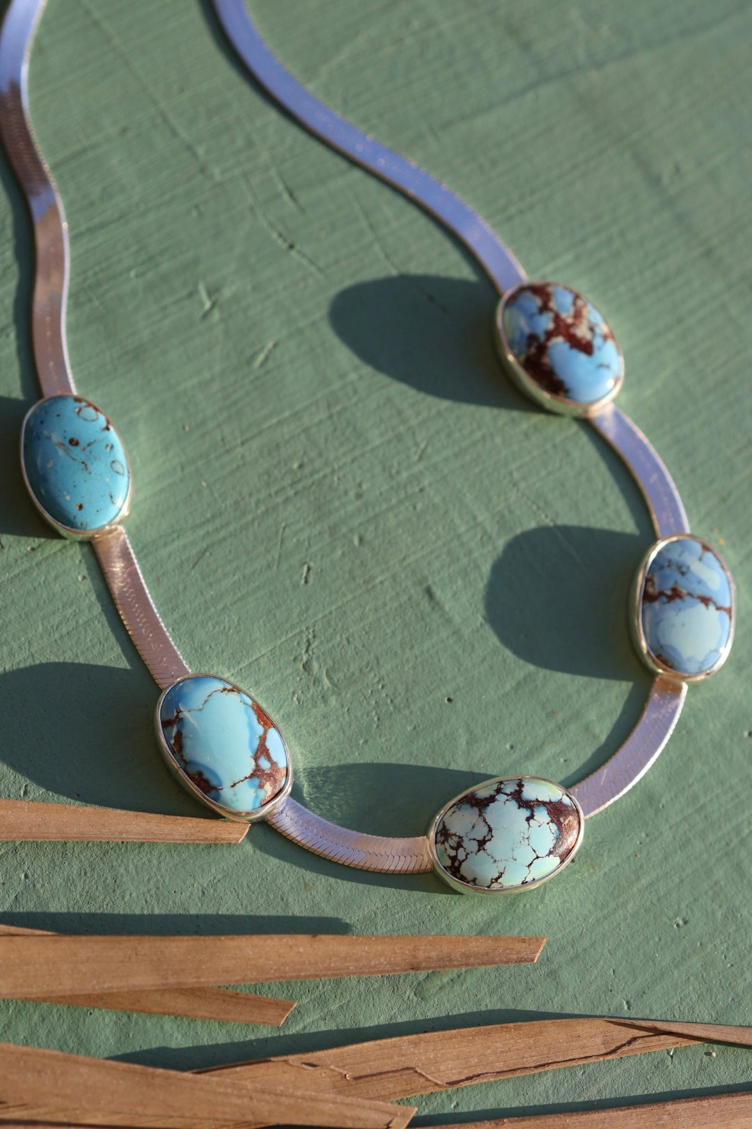 Featuring five gorgeous stones set on a .925 sterling silver flat curb chain.