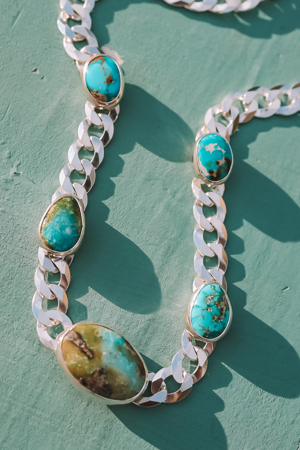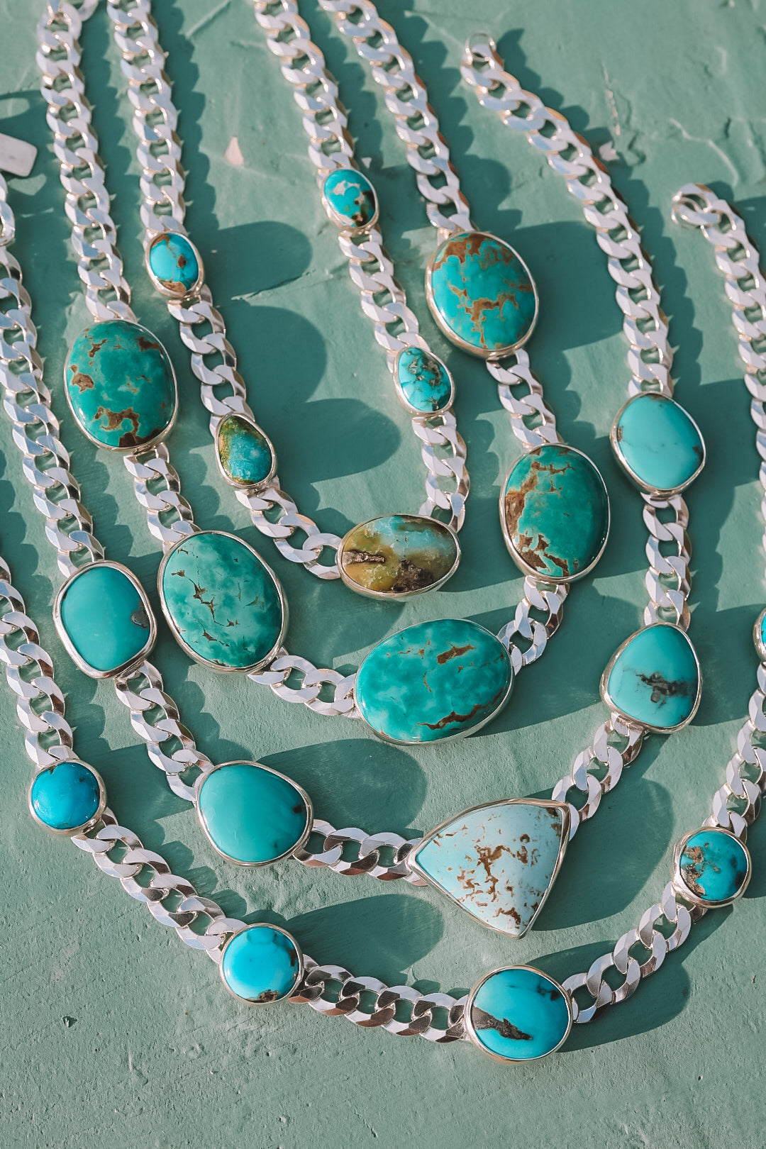 MEASUREMENTS: 14" curb chain with various sizes of turquoise. If you would like a chain extender added, please let me know BEFORE your order ships and I'm happy to throw one in for you. I can do 1", 2", or 3". If you would like an extender please email me at info@radicaljewelryco.com. If you need an extender after your receive your necklace they are available for purchase in my shop listed under "SHOP ALL"