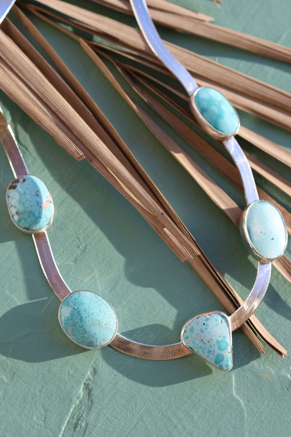 Featuring five gorgeous stones set on a .925 sterling silver flat curb or herringbone chain.
