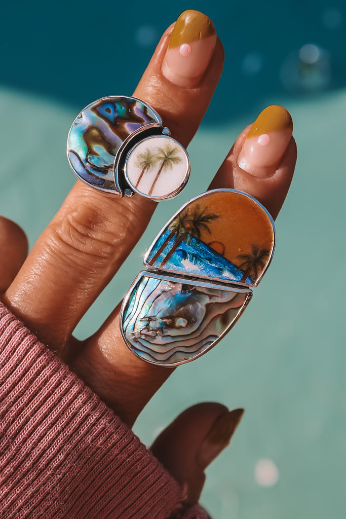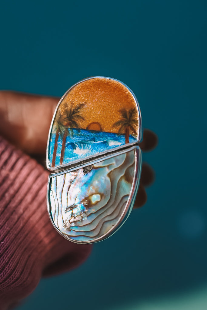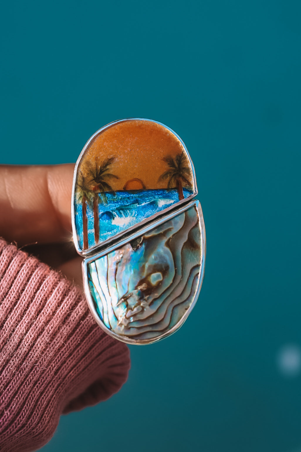 ENAMELED BEACH SCENE & ABALONE RING- size 7