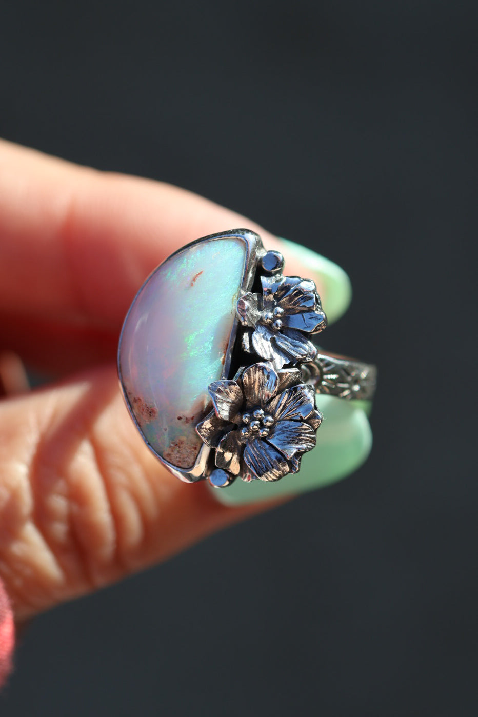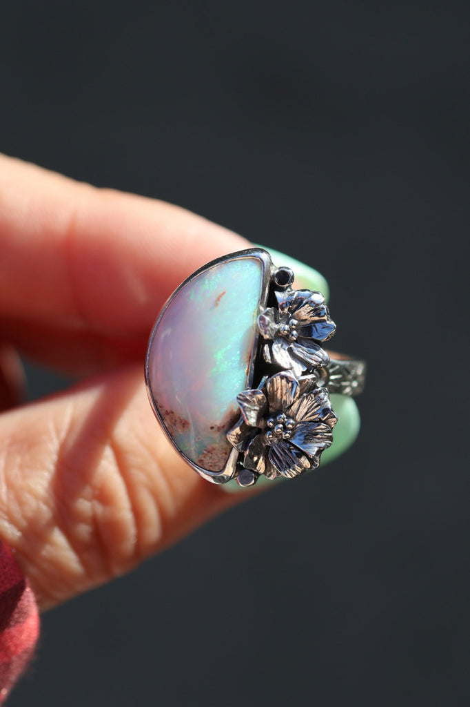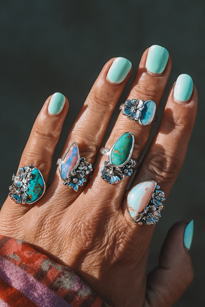 Each ring feels like a daydream made solid! Gorgeous stones cradled in hand-forged blooms. Soft & feminine, yet full of strength & light. Little worlds that catch the sun and hold their own kind of magic!