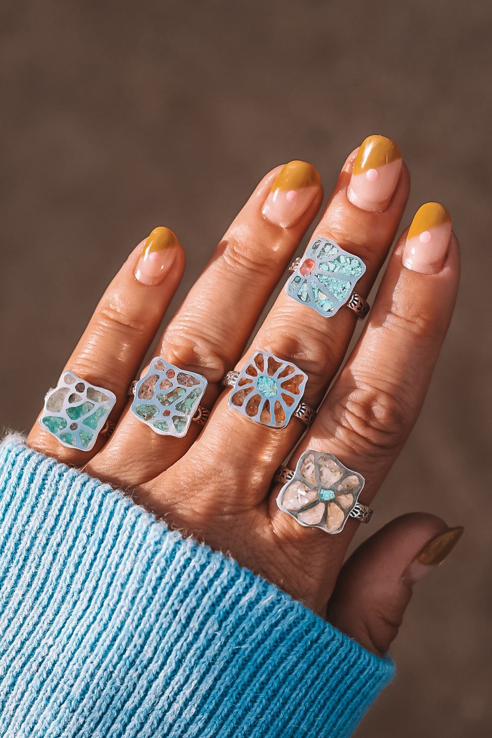 These everyday rings are perfect worn solo for a subtle touch or mix n match them with your favorite bands for an effortlessly chic vibe! Originally hand carved from wax and then cast to silver and inlaid with natural stones