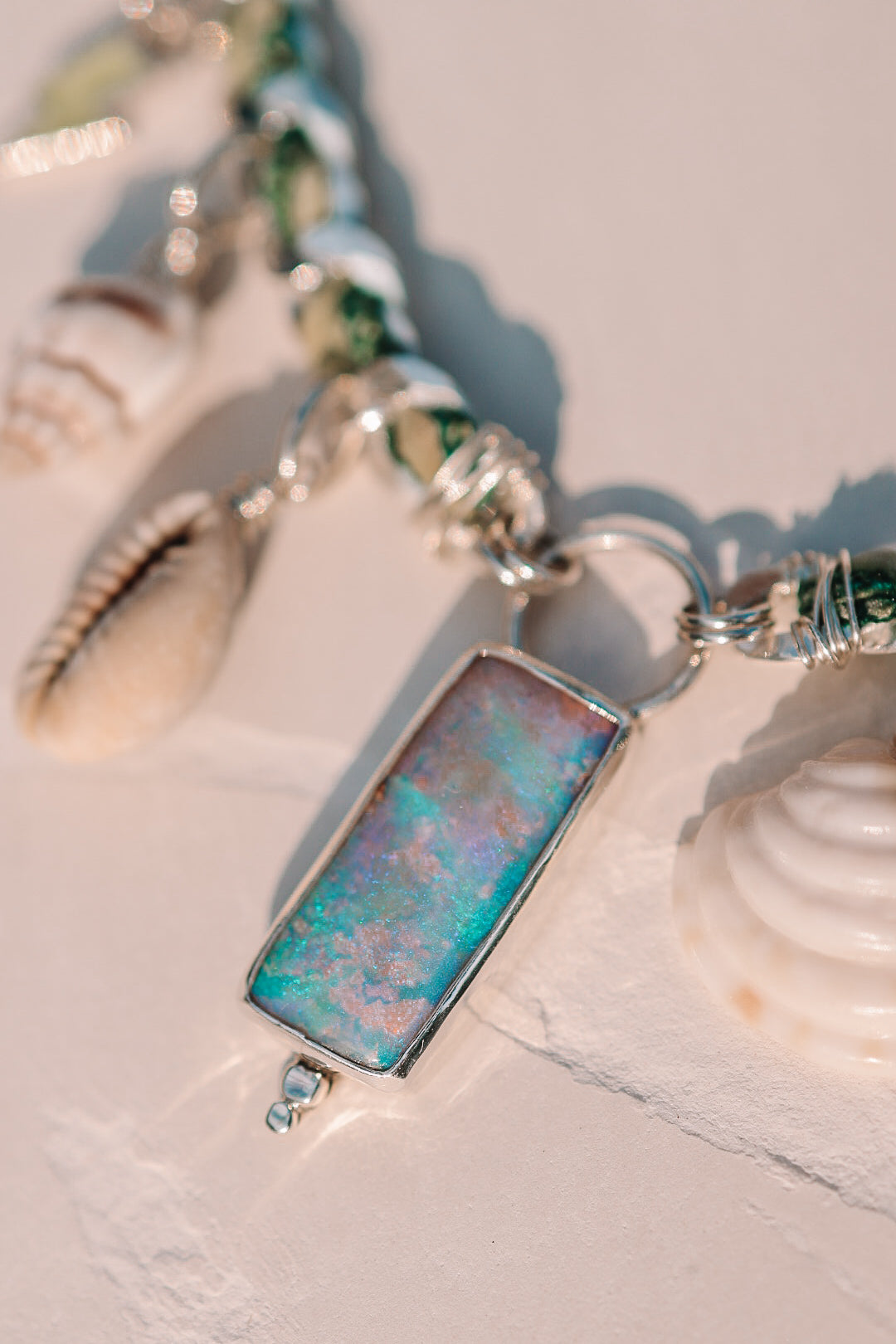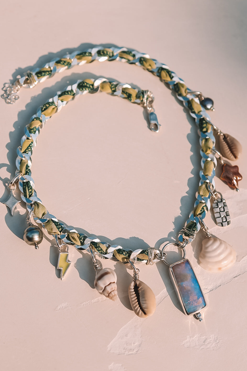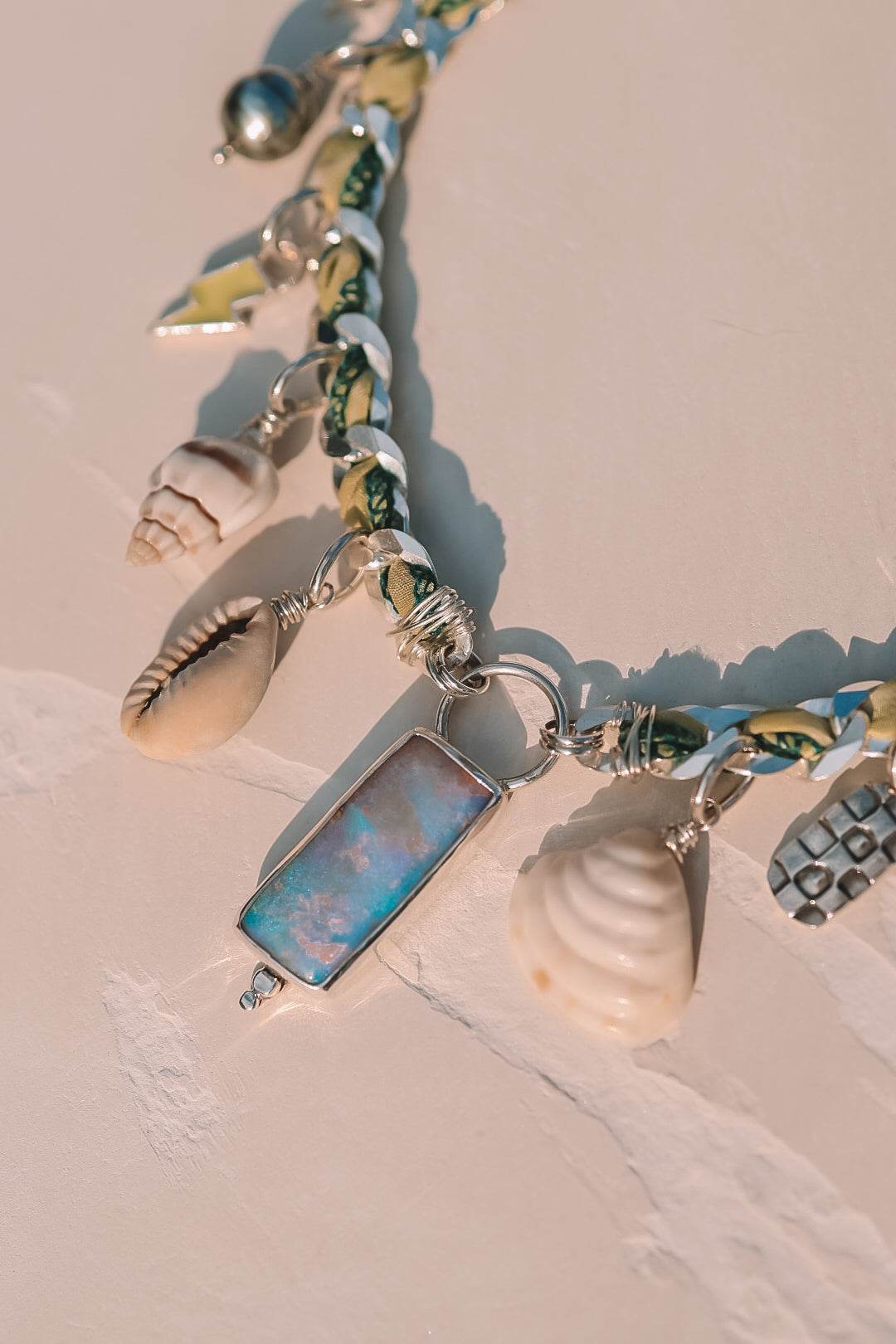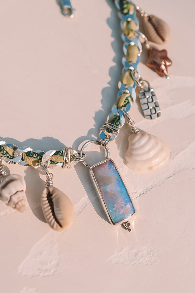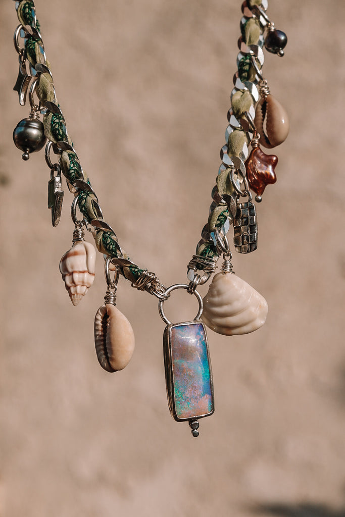 A necklace featuring all the best things. A gorgeous pink & teal Australian pipe opal, cowrie shells from bora bora, Tahitian pearl, and other handmade charms. The thick curb chain features recycled woven silk that adds the perfect pop of color. This baby is ohhh sooo ONE OF A KIND!